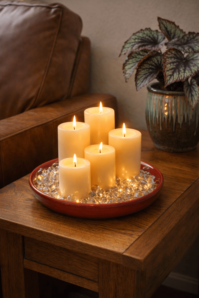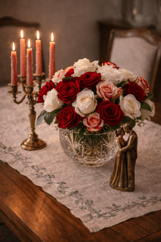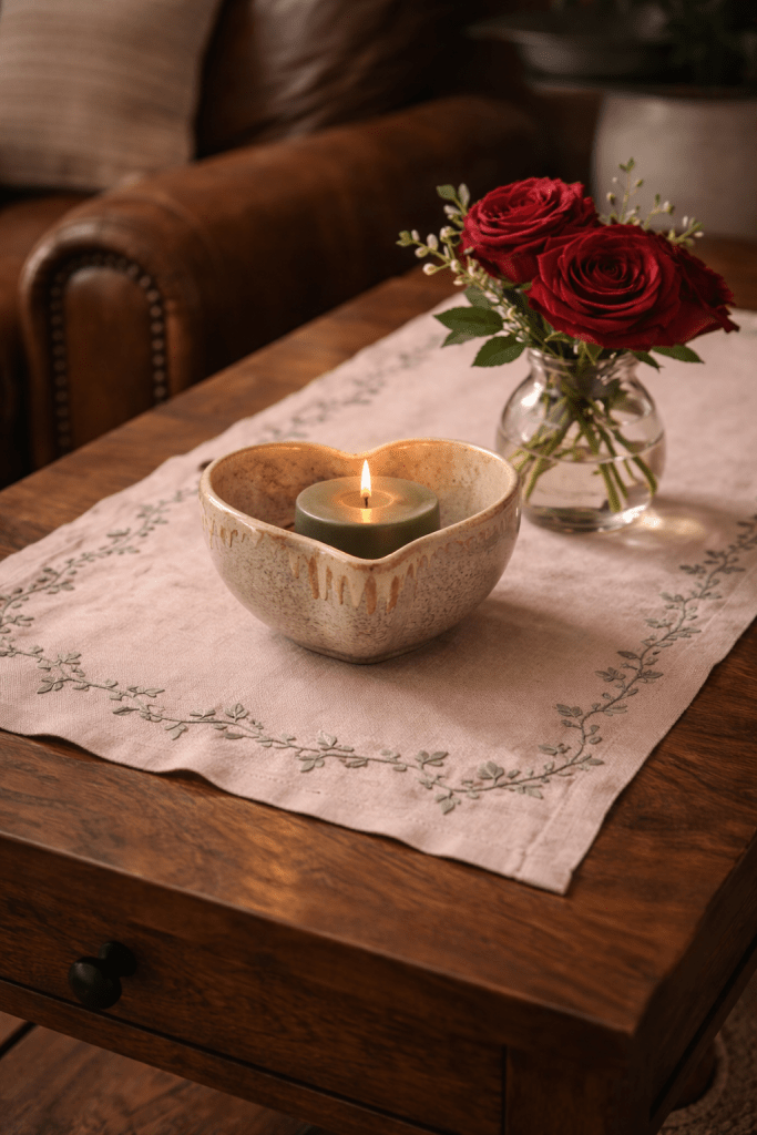 A coffee table vignette, for example, can be as simple as a runner, a candle, and one small Valentine accent. A single rose in a bud vase, a small seasonal sign, or a bowl with heart-shaped treats is often enough.